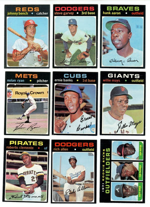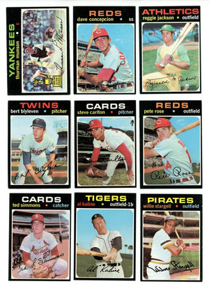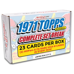 Each 1971 Topps Baseball Complete Set Break Box will have 23 (or more) cards, including 2 Hall of Famers and 3 (or more) rare high numbered cards!